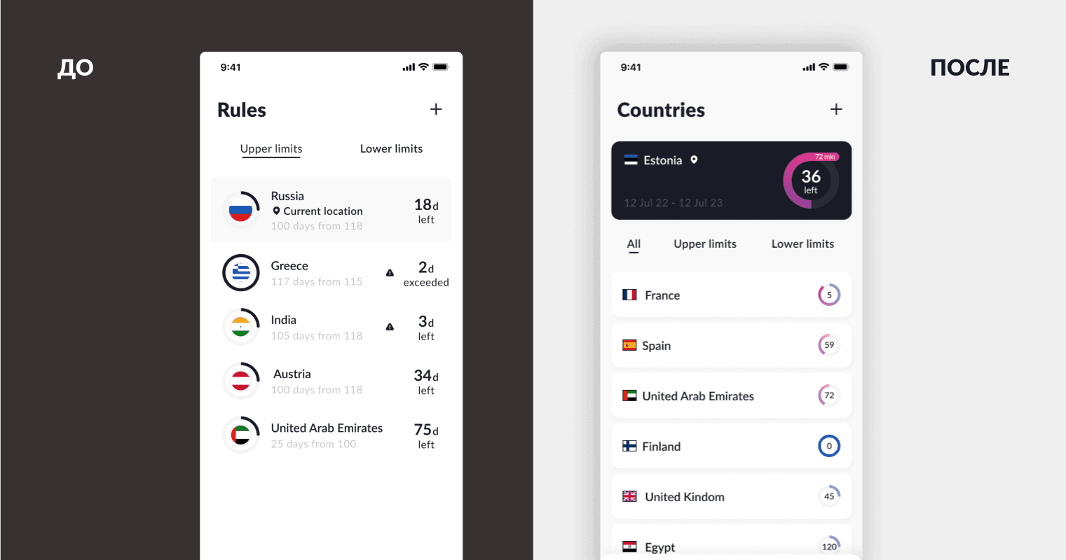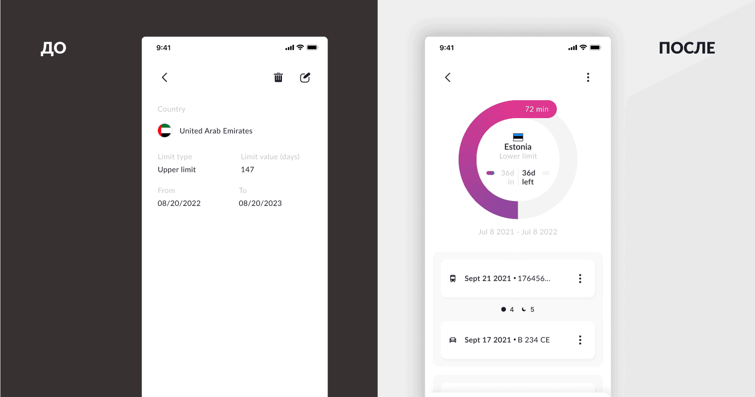 Кроме этого, такая важная информация, как текущая локация и количество дней до достижения лимита выделены недостаточно наглядно. В целом реализация карточек переполнена текстовой информацией, что с одной стороны хорошо - потому что пользователю не придется догадываться о значении тех или иных визуальных решений, однако с другой - нагружает пользователя и замедляет считывание.