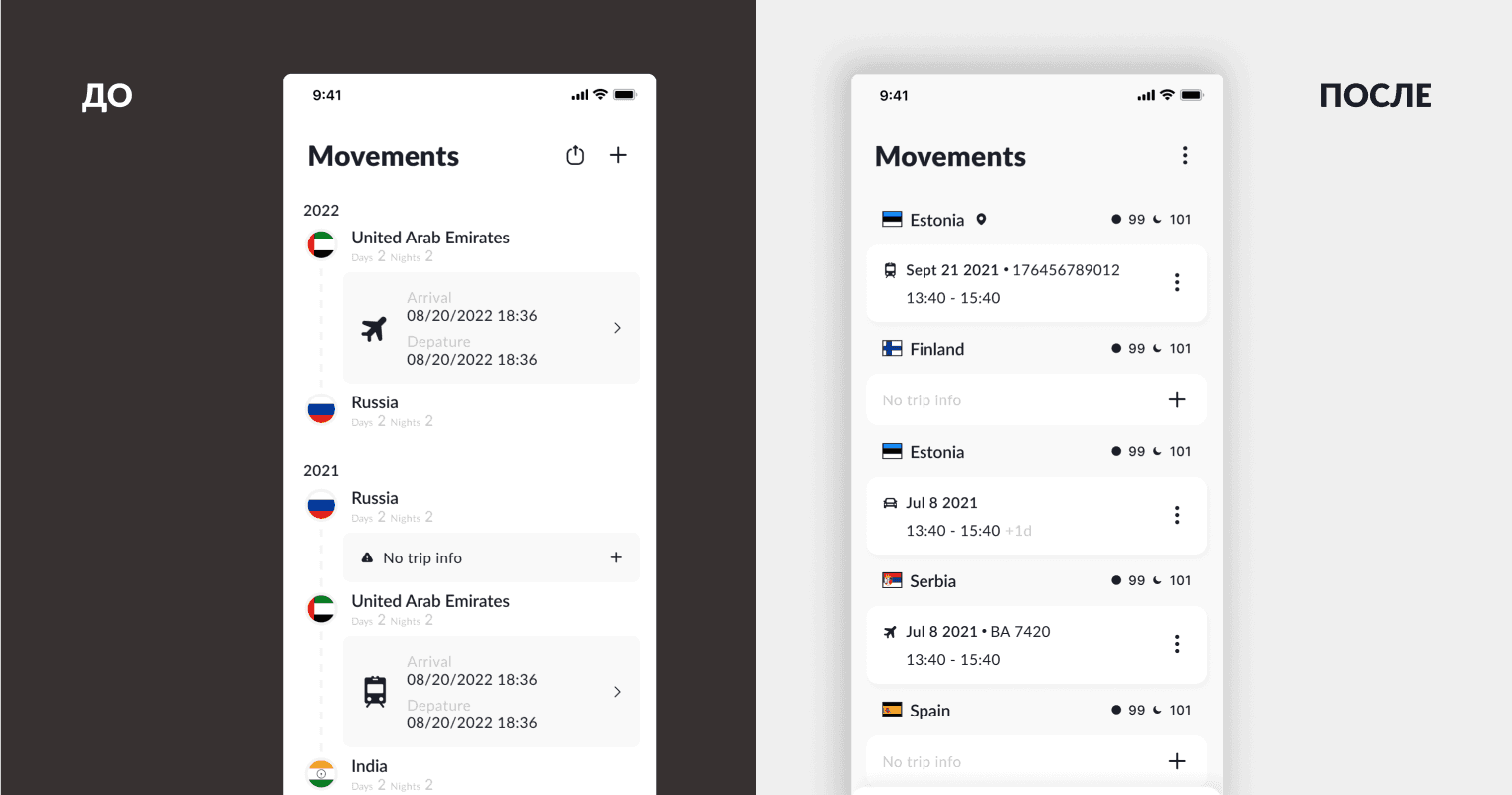 Данные о времени пребывания также были лишены текстового сопровождения и расположены в строке с названием страны, чтобы увеличить количество отображаемых перемещений на экране.