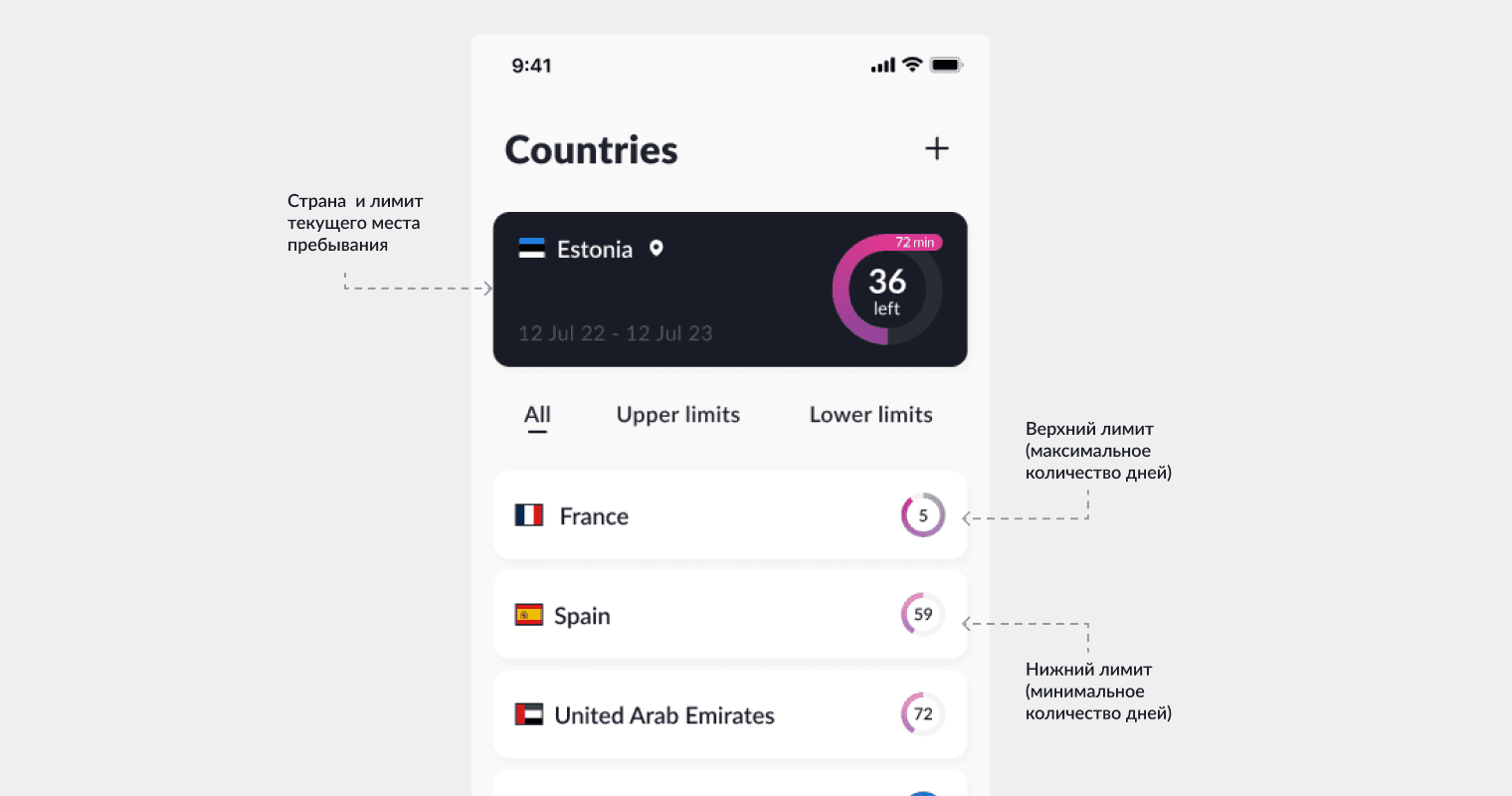 Страница лимита содержит полную информацию о соблюдении заданных условий: тип лимита, значение лимита, количество дней, проведенных в стране, количество дней, которое осталось для достижения лимита (в зависимости от типа лимита подсвечивается первая или вторая цифра), период действия лимита.