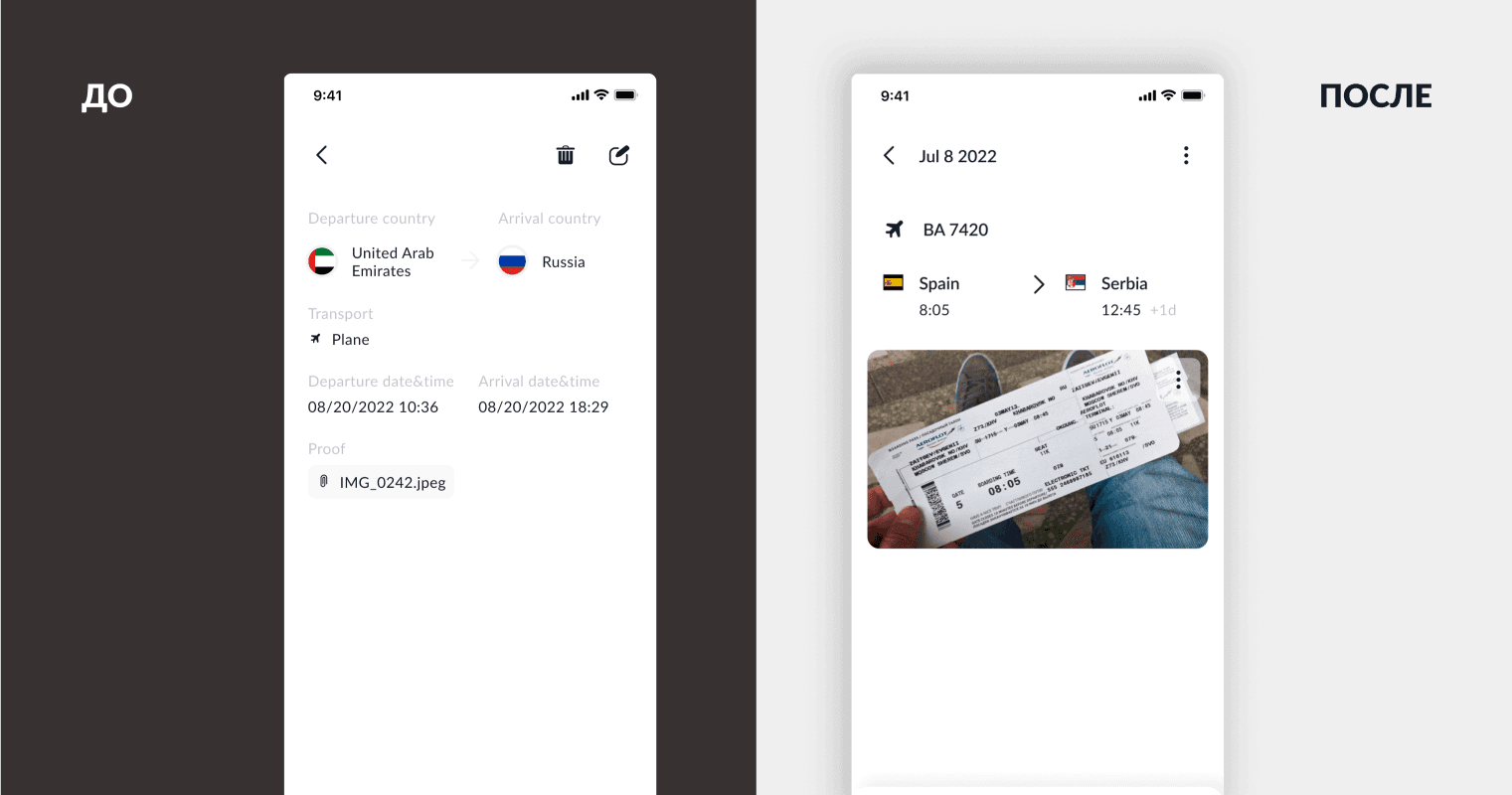 Из карточки были убраны подписи к данным, при этом сами данные расположены так, чтобы уменьшить вероятность возникновения вопросов у пользователя о их смысле. В качестве референсов было использовано расположение данных в авиабилетах.
