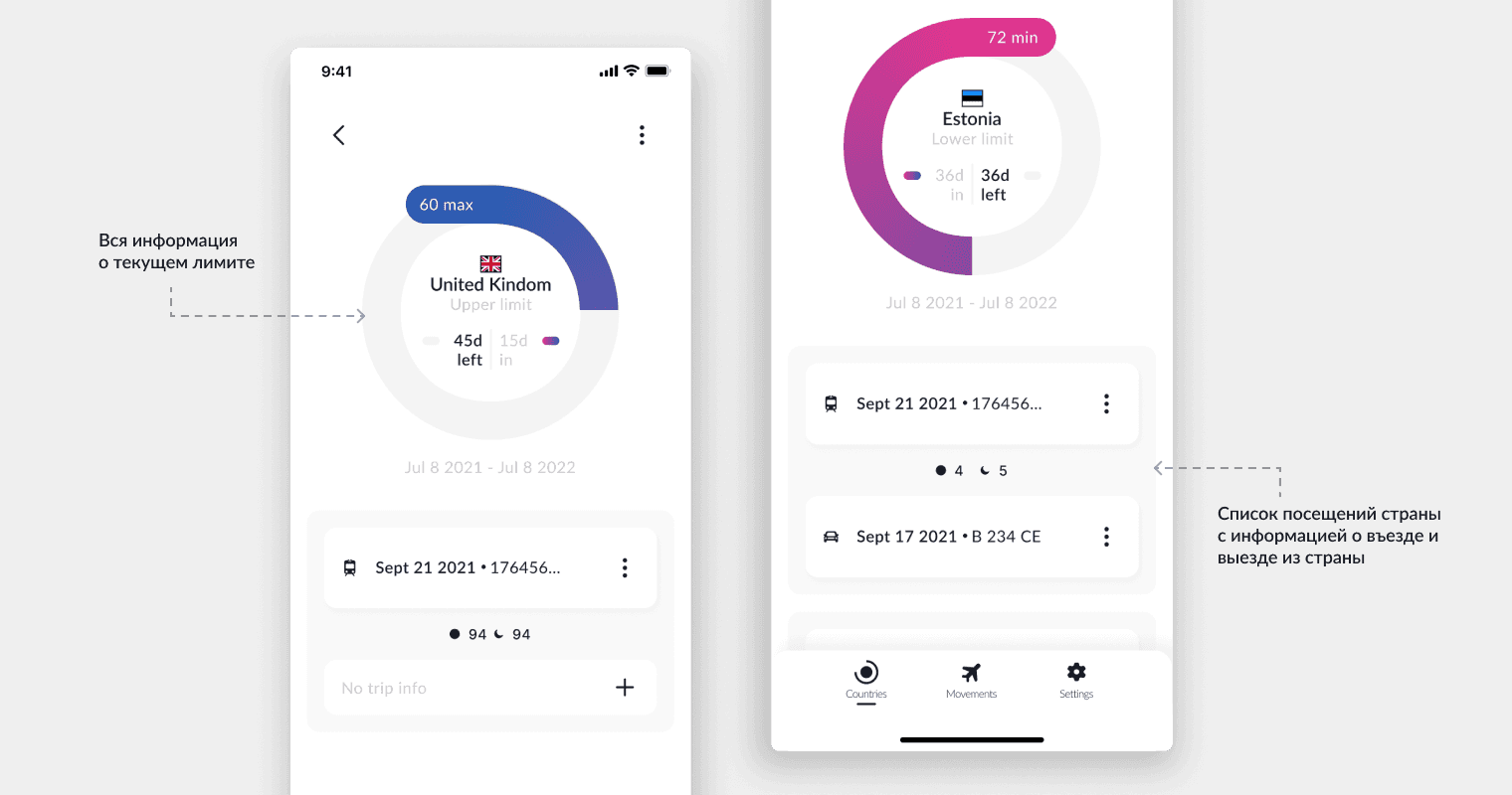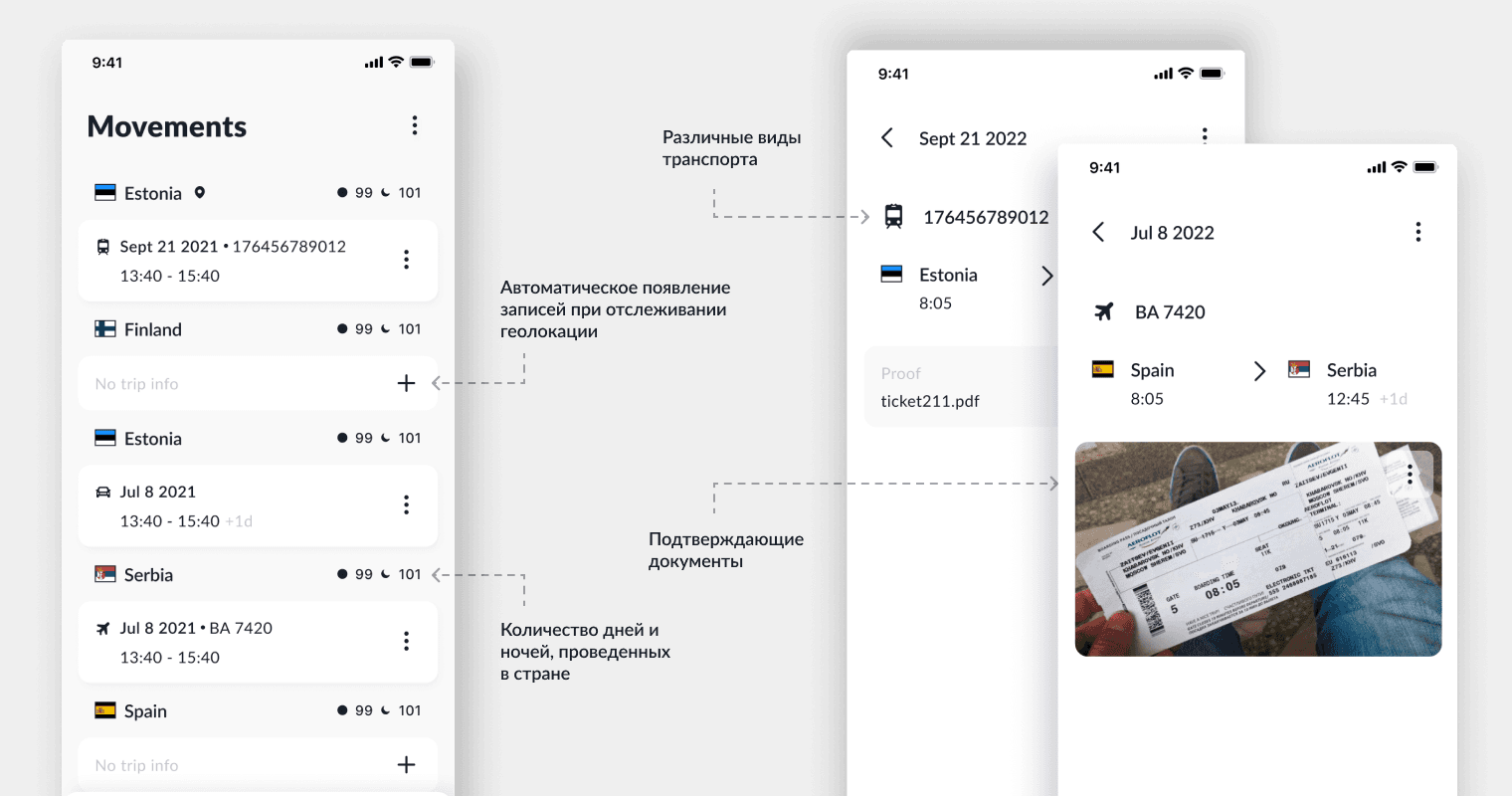 Одна из главных фичей приложения - отслеживание перемещений по локации пользователя, чтобы при смене страны автоматически появлялась пустая запись о перемещении. Так все перемещения оказываются учтены, а пользователю остается только заполнить информацию о нем.